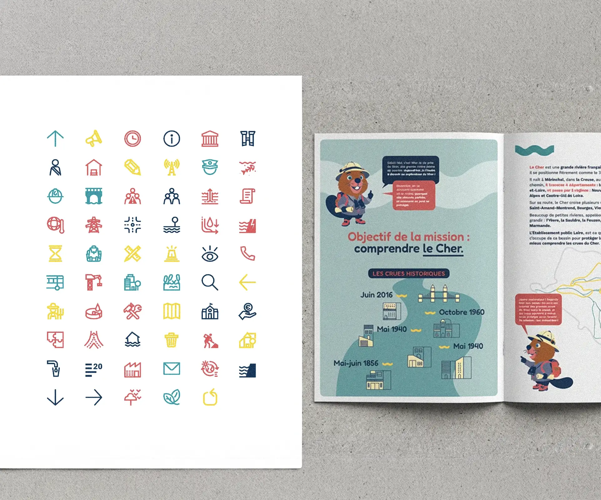 L’identité visuelle créee comprend la création du logo (déclinable pour chaque affluent), l’élaboration de la charte graphique, le développement d’une version animée ainsi qu’un système d’illustrations et de pictogrammes. L’ensemble forme un territoire graphique cohérent, pédagogique et facilement appropriable par les acteurs du territoire.