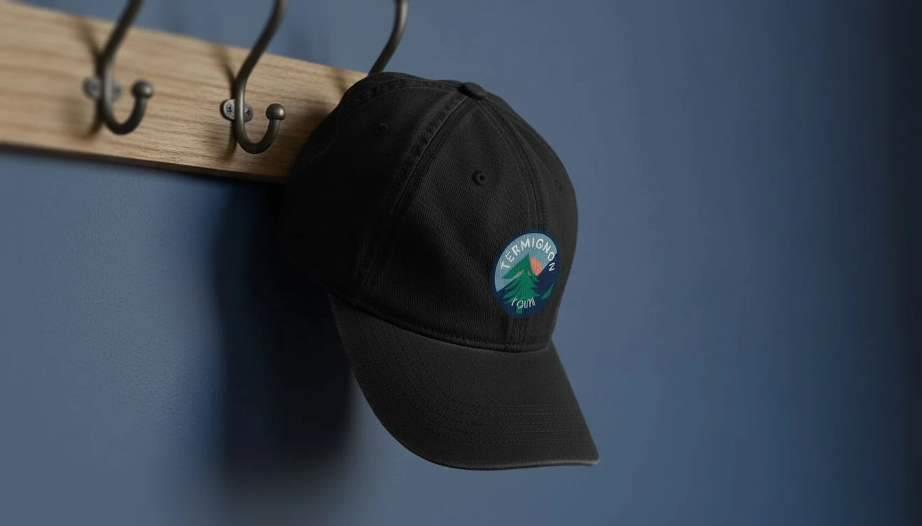 Casquette noire suspendue à un porte-manteau, ornée du logo circulaire « Termignon l’Outa » représentant une montagne stylisée.