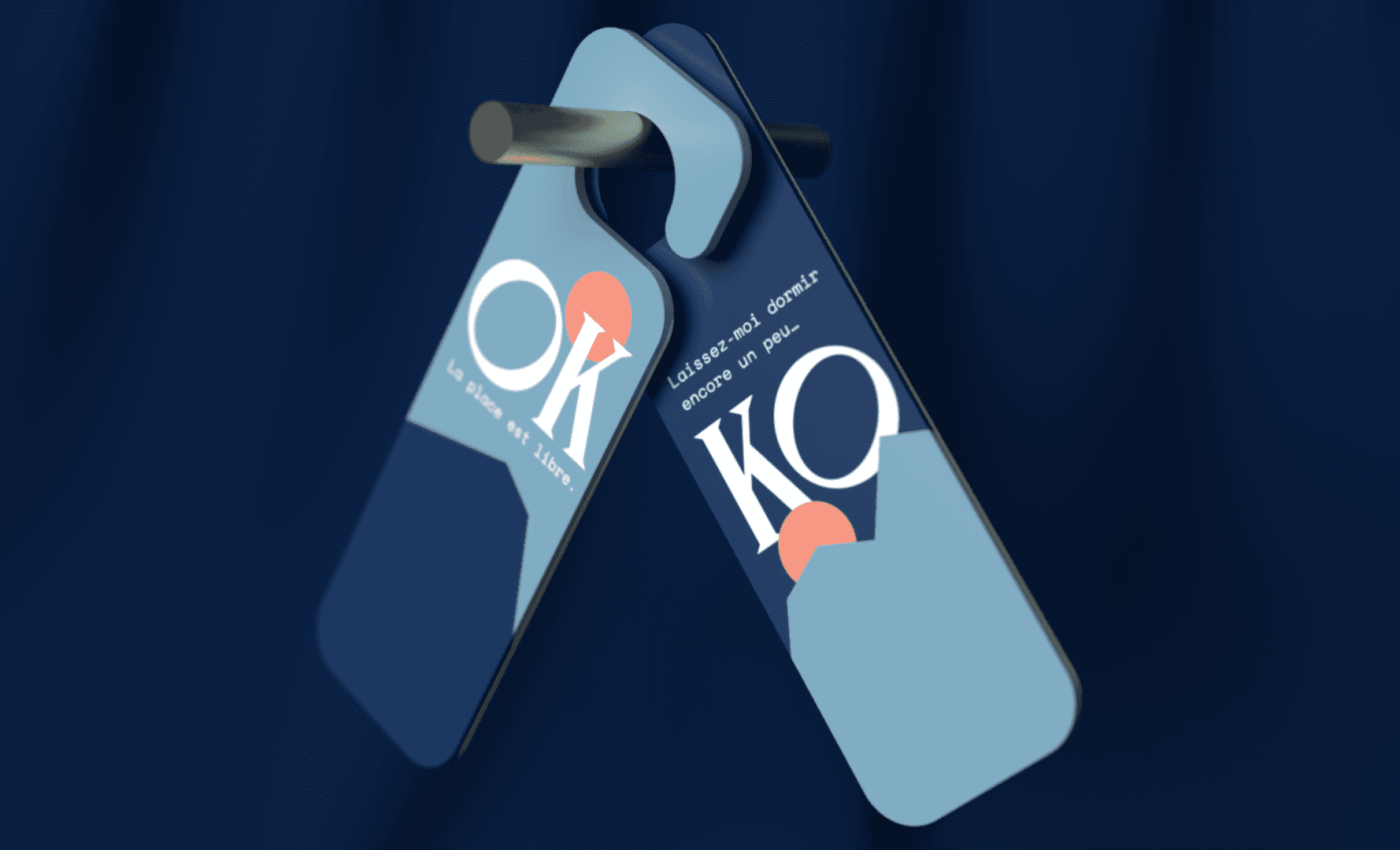 Accroche-portes de l’Hôtel Outa au design graphique bleu, avec les messages typographiques “OK, la place est libre” et “KO, laissez-moi dormir encore un peu”, suspendus à une poignée.