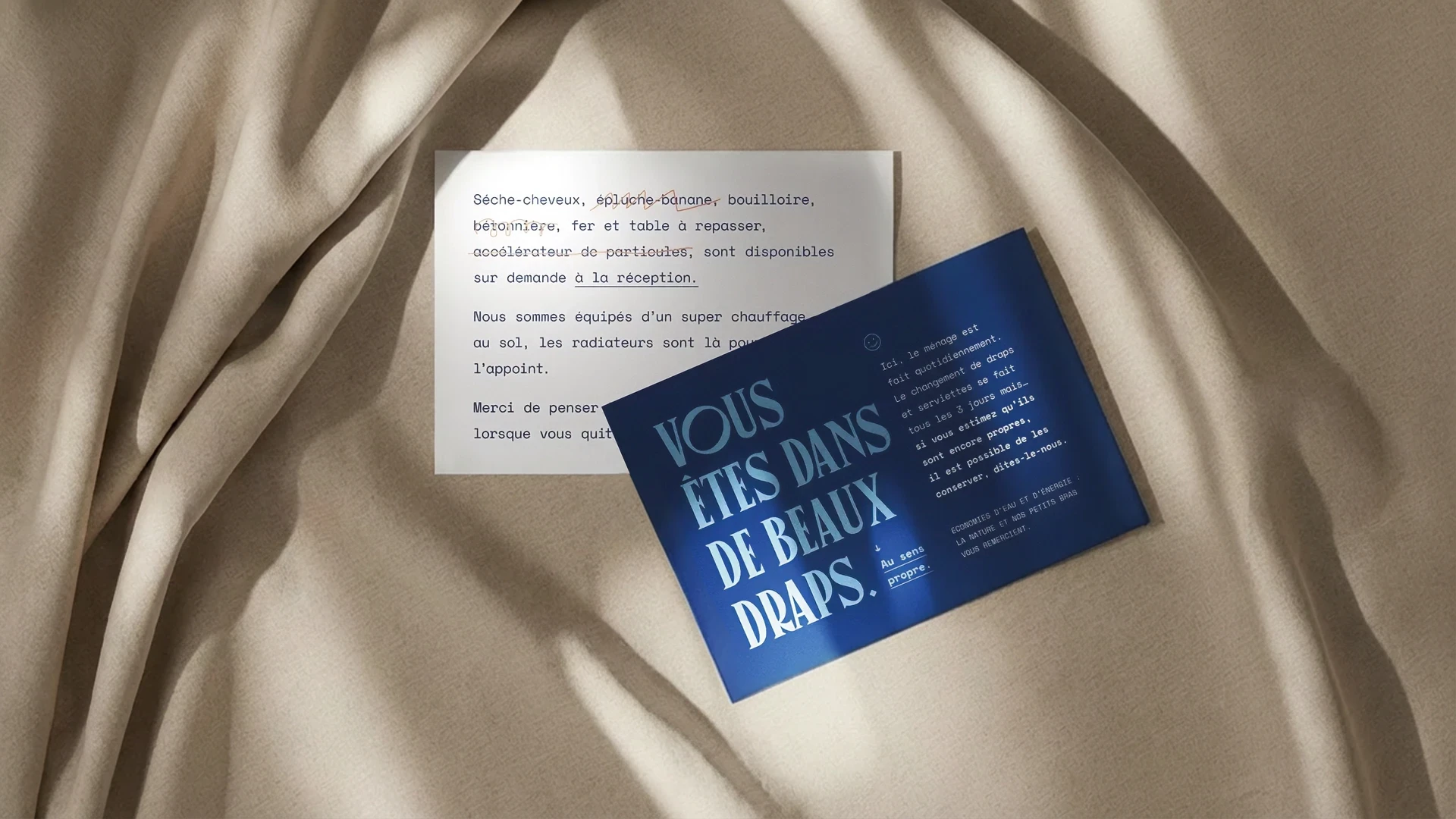 Deux cartes de communication créées pour l’Hôtel Outa : une carte blanche avec une liste de services barrés de façon humoristique et une carte bleue avec le message typographique “Vous êtes dans de beaux draps”, posées sur un drap beige.