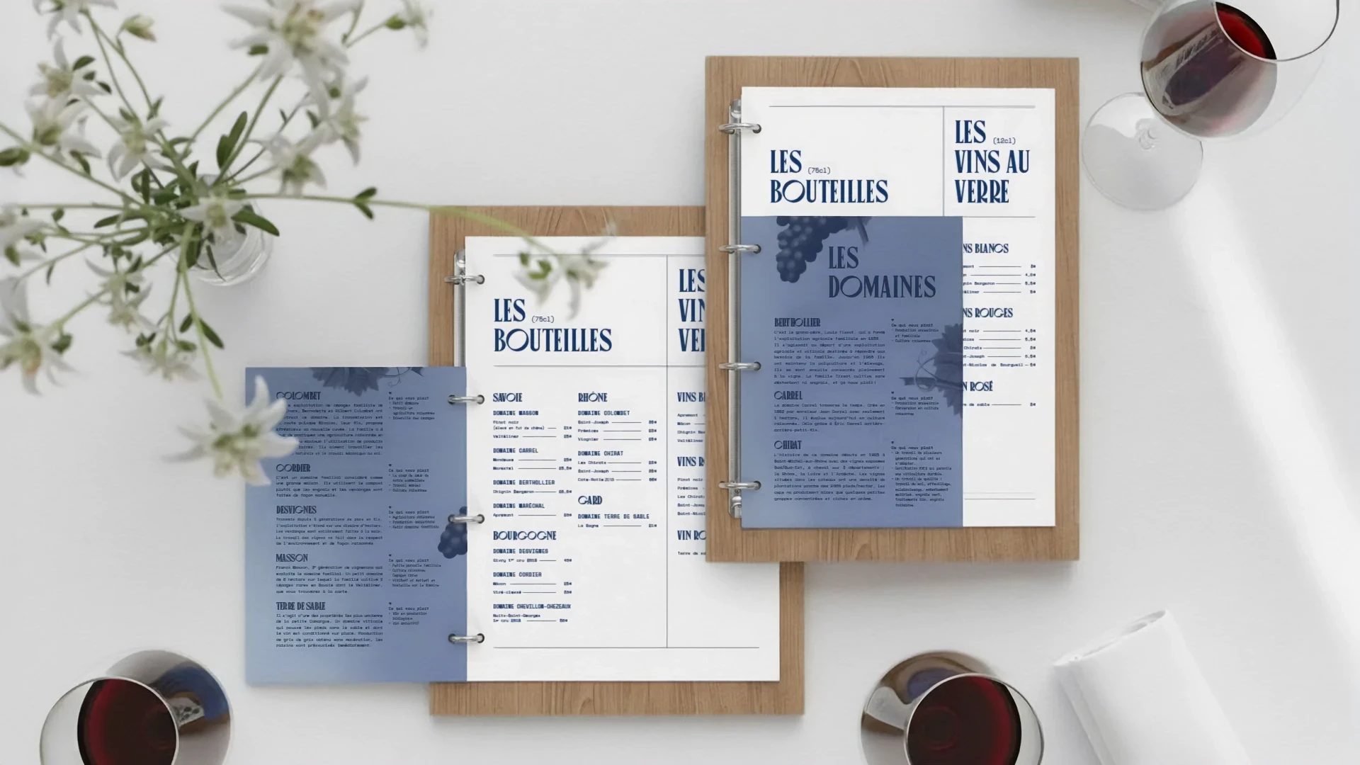 Cartes des vins de l’Hôtel Outa présentées sur planches en bois, design éditorial bleu et blanc avec typographie élégante et rubriques par domaines viticoles.