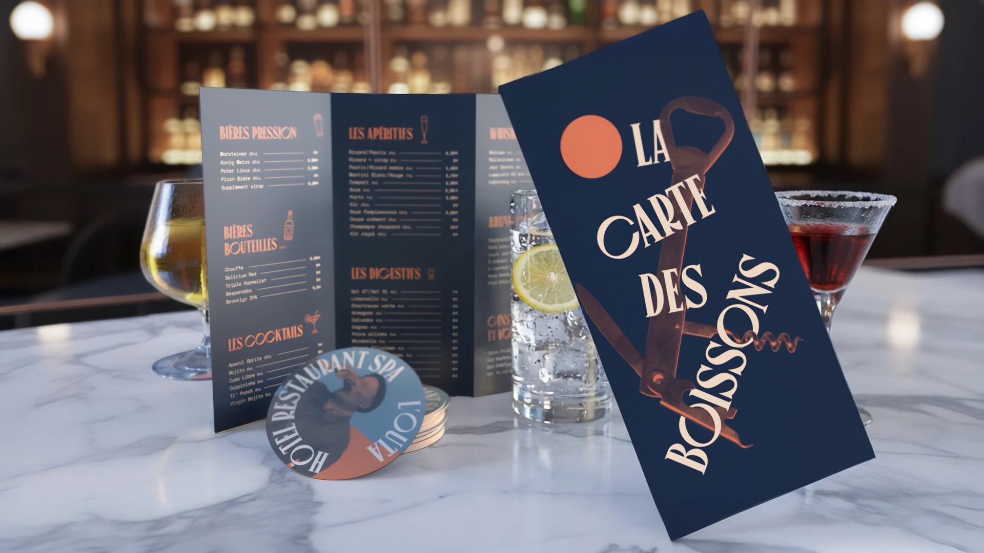 Carte des boissons de l’Hôtel Outa avec design graphique bleu nuit et typographie rétro, présentée sur un bar avec sous-bocks personnalisés et verres de cocktails.